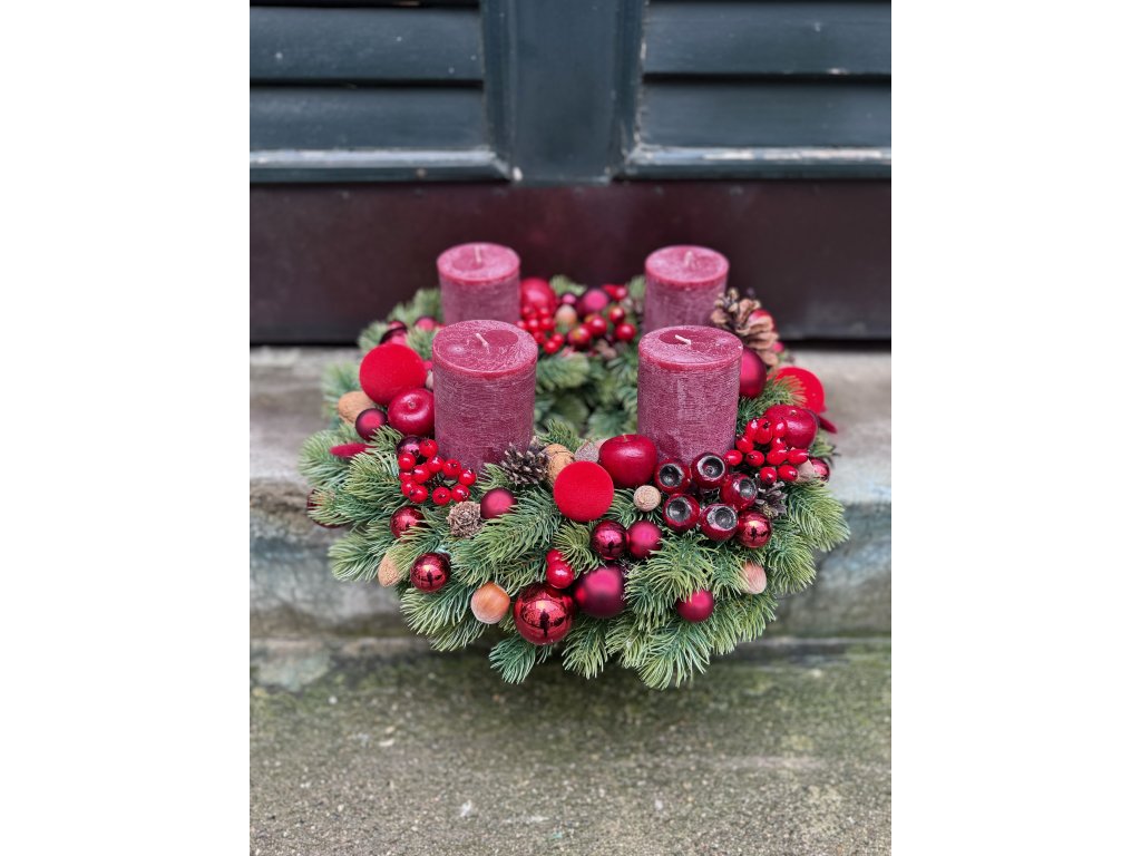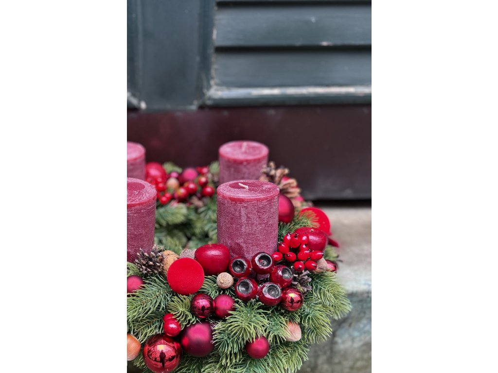 Adventní věnec z umělého chvojí zdobený do červena, vydrží dlouuuhé roky, jiné barevné kombinace možné!